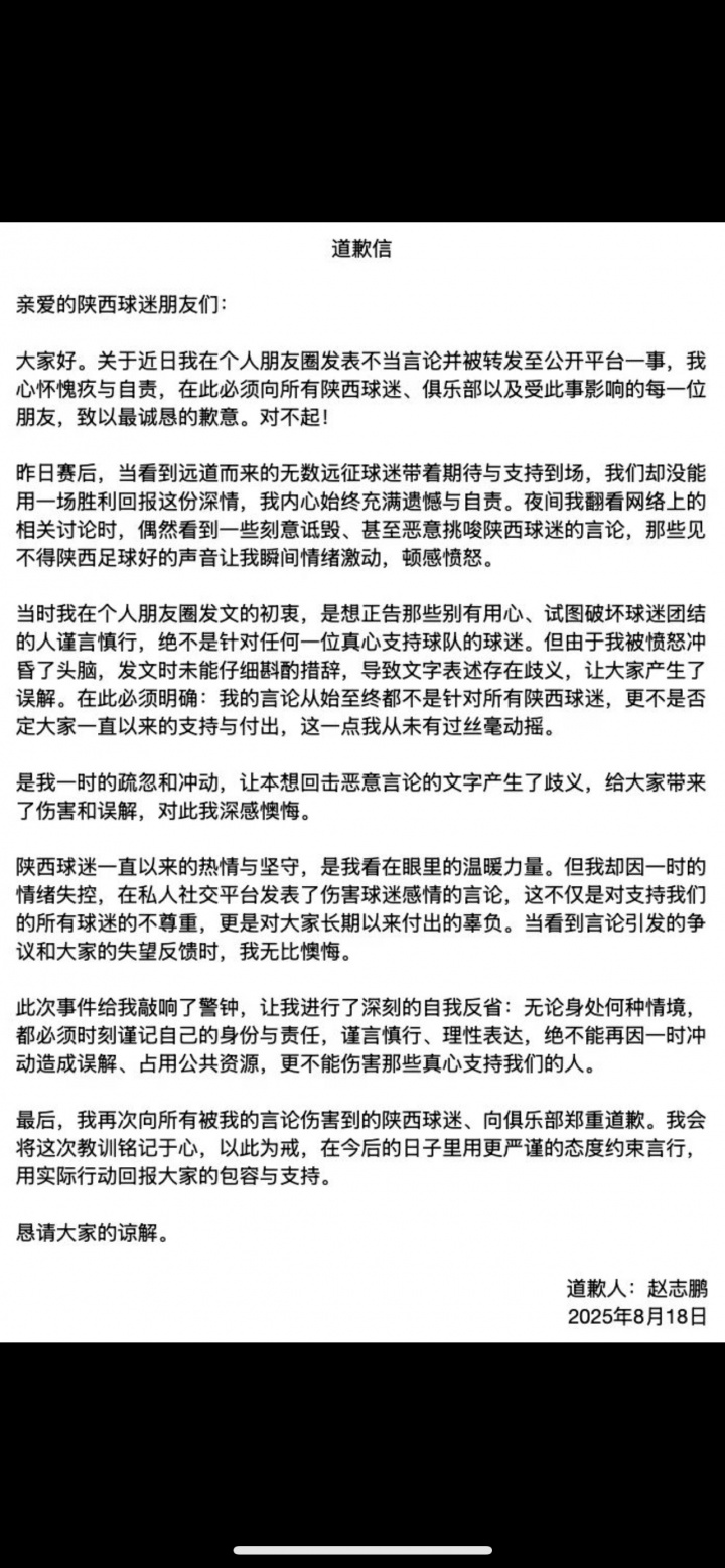 其个人道歉信内容如下
